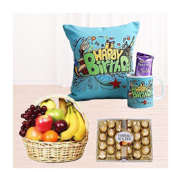 Nestled in this charming basket is an irresistible assortment of fruit, chocolates, and other sweet treats. The perfect gift for any occasion, this bountiful arrangement is sure to please. overflowing with fresh seasonal fruit, delicious Ferrero Rocher chocolates, a set of photo cushions with a mug, and a bar of Dairy Milk Silk chocolate, it's a gift that will be remembered long after the last bite is gone.