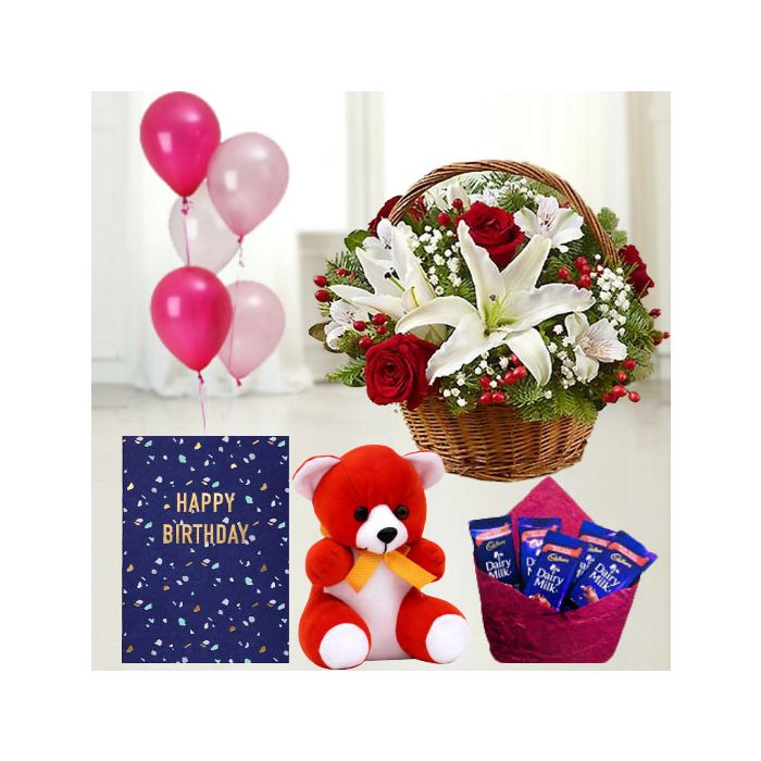 Start your birthday celebrations with this uniquely designed gift basket! It includes a beautiful arrangement of 2 white lilies and 10 red roses, a 6 inch teddybear, and a set of 5 delicious dairy milk chocolates. The birthday greeting card with 5 blown balloons is the perfect addition to this special gift.