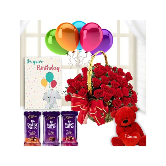 Wish your beloved a very happy birthday with this beautiful gift hamper. It comprises of a basket of 25 red roses, 1 feet height red teddybear, 3 dairy milk silk chocolates and a birthday greeting card with 5 blown balloons. The gorgeous red roses are arranged in a basket and the soft teddybear will make the perfect cuddle buddy. The dairy milk silk chocolates are sure to tantalize their taste buds. The birthday greeting card with 5 blown balloons will express your heartfelt wishes perfectly. This delightful hamper is sure to bring a smile on their face.