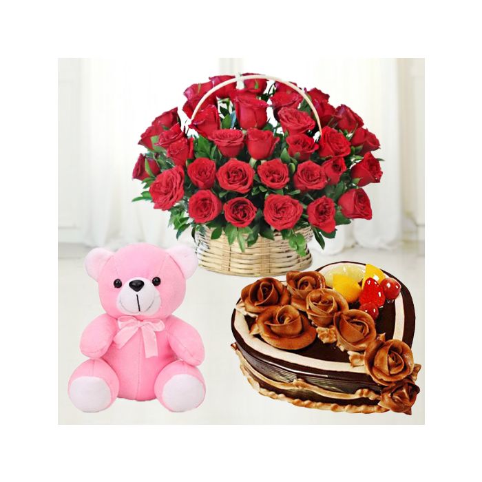 Product Description 5 | Basket of 25 red roses, chocolate heart shape cake with exotic fruits topping & 1 feet height teddybear |