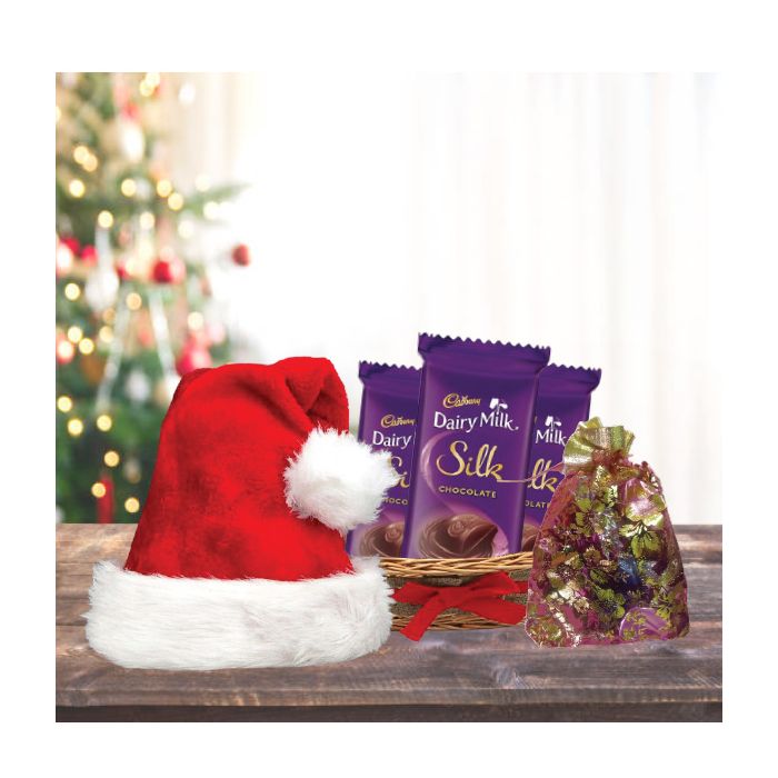 Basket Of 3 Dairy Milk Silk With Santa Cap And Assorted Home Made Chocolates