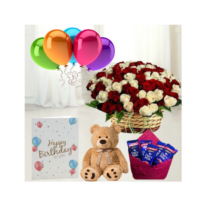 Basket of 30 red and white roses, 6 inch teddybear, set of 5 dairy milk chocolates, birthday greeting card with 5 blown balloons