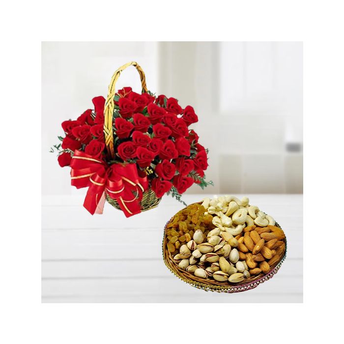 Looking for a special way to show your loved ones how much you care? A basket of 30 red roses with half kg assorted dryfruits from our collection is the perfect gift! The beautiful blooms are arranged in a basket with an assortment of delicious dried fruits, making it a truly luxurious and unique present. Whether for a birthday, anniversary, Valentine's Day, or any other special occasion, this enchanting gift is sure to put a smile on their face.