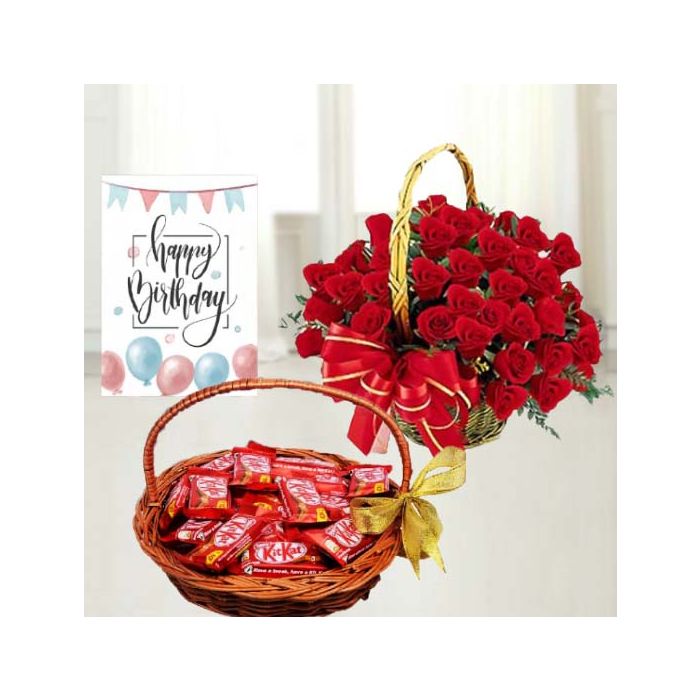 Basket of 40 red roses, Basket of 20 kitkat chocolates , birthday greeting card
