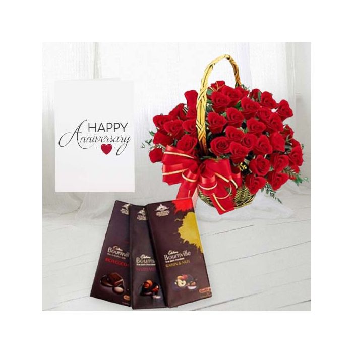 Basket of 40 red roses, set of 3 bournville chocolates , anniversary greeting card