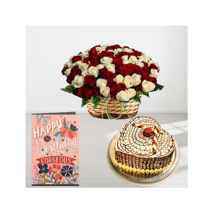 Basket of 50 red and white roses, butterscotch heart shape cake, birthday greeting card