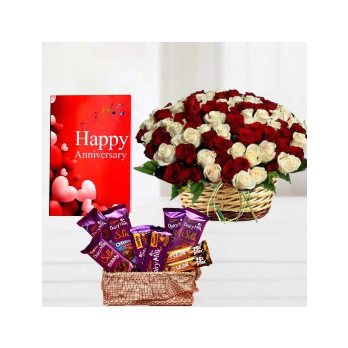 Looking for the perfect way to celebrate an anniversary? Look no further than this stunning basket of 50 red and white roses! It's a romantic and elegant gesture that is sure to make your loved one feel special. The basket also includes seven delicious Dairy milk silk, two Fivestar, and an anniversary greeting card. This is a gift that they will treasure forever!