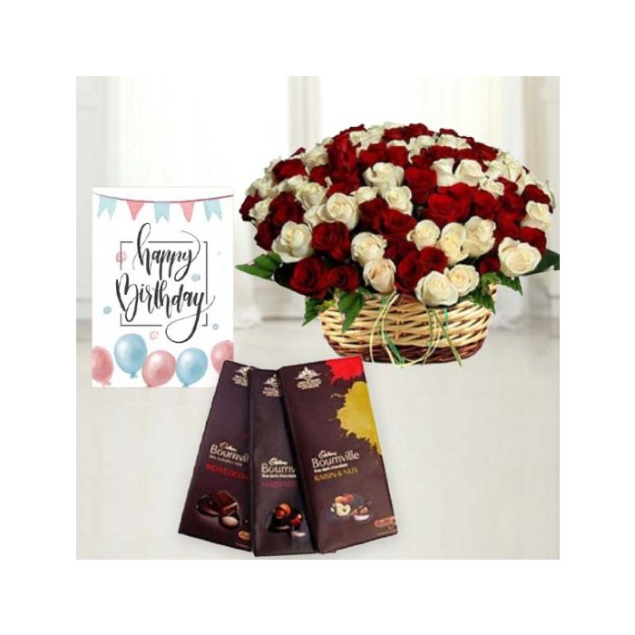 Basket of 50 red and white roses, set of 3 bournville chocolates, birthday greeting card