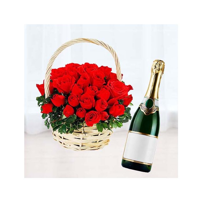 Product Description 5 | Basket of 50 red roses with Bottle of champegne |