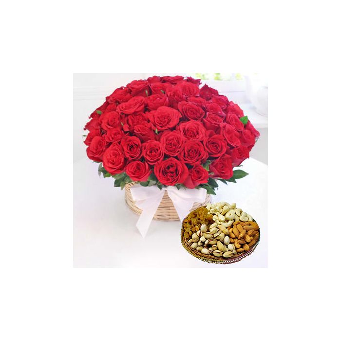 Looking for a romantic gesture that will really impress your special someone? Look no further than this gorgeous basket of 50 red roses, accompanied by a box of delicious half kg assorted dry fruits. The perfect way to show your love and affection, this stunning arrangement is sure to make a lasting impression.