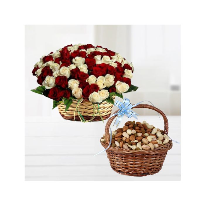 Looking for a gift that is sure to impress? Look no further than this stunning basket of 50 red and white roses, paired with half a kilogram of assorted dry fruits. This luxurious gift is perfect for any occasion, and is sure to put a smile on the recipient's face.The roses are expertly arranged in a beautiful basket, and the dry fruits are hand-selected to ensure only the finest quality. Treat someone special today with this unforgettable gift.
