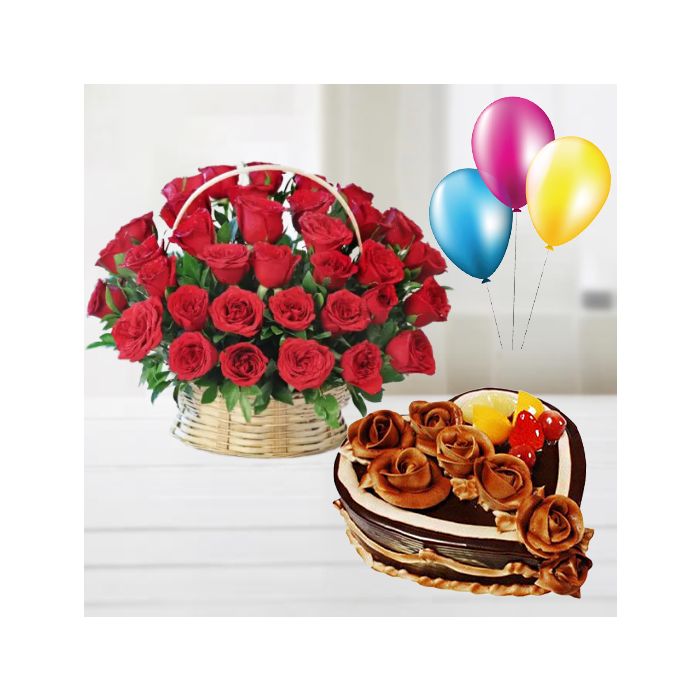 Basket of 60 red roses with chocolate heart shape cake with 3 blown balloons
