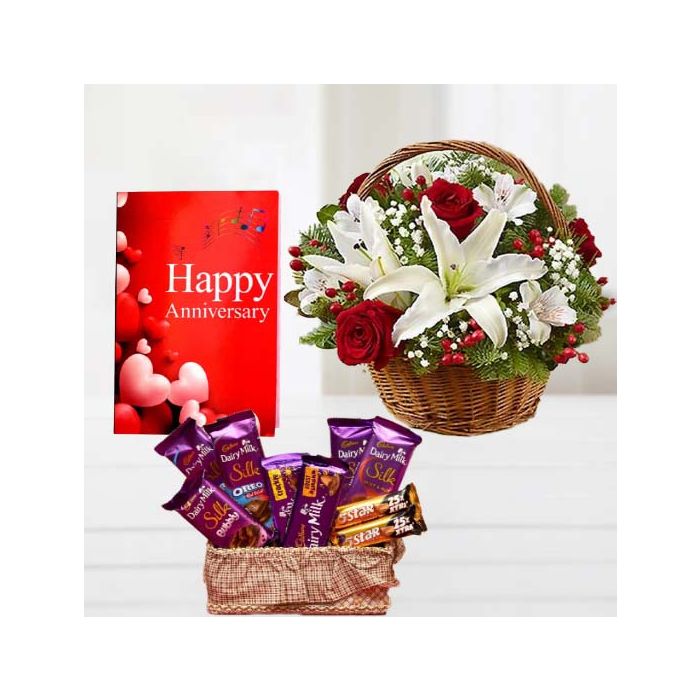 Basket of red roses with white lilies, Basket of 7 dairymilk silk, 2 Fivestar, anniversary greeting card