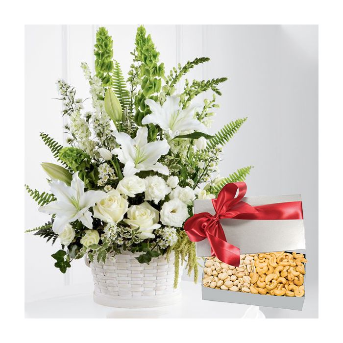 Looking for a gift that is sure to impress? Look no further than this basket of white exotic flowers with assorted cashew&pistachio. This beautiful arrangement is perfect for any occasion, and is sure to make a lasting impression. The basket includes a variety of white flowers, along with cashew&pistachio, making it a truly unique gift.