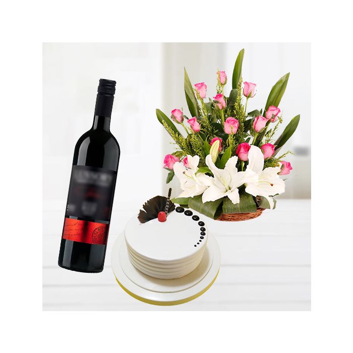 Basket of white lilies with pink roses with pineapple premium quality cake with bottle of red wine