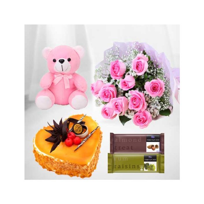 What could be more romantic than a beautiful bouquet of 10 pink roses? This stunning arrangement comes with a 6 inch pink teddybear and a pair of 2 temptations chocolates, making it the perfect gift for your special someone. The premium quality mango cool cake is also a delicious treat that is sure to please. Order this incredible gift today and let your loved one know how much you care.