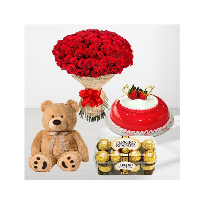 Beautiful Bouquet of 100 red dutch roses, with 1 feet height teddybear, strawberry cool cake with 16 pcs rocher ferrero chocolates is the perfect way to show your loved ones how much you care. This stunning gift is sure to impress with its luxurious details. The bouquet of red roses is expertly arranged and tied with a red ribbon, adding an elegant touch. The teddybear is sure to please with its soft fur and adorable features. The cake is delicious and moist, and the chocolate is rich and decadent. This gift is sure to make a lasting impression.