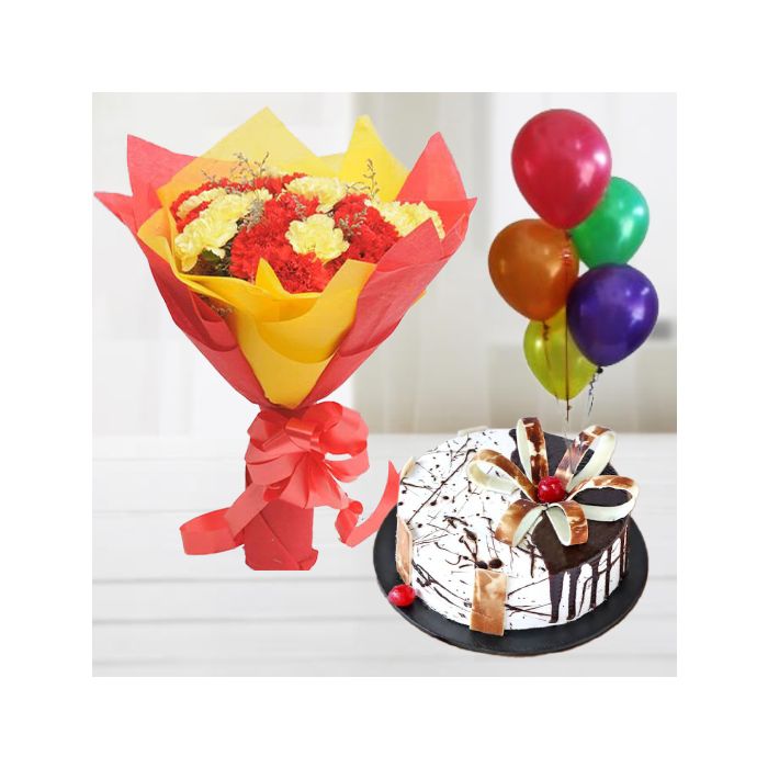 Looking for a way to brighten up someone's day? Send them this beautiful bunch of 20 red and yellow carnations, paired with a delicious chocovanilla cake and 5 blown balloons. It's the perfect way to let them know you're thinking of them - and is sure to put a smile on their face!