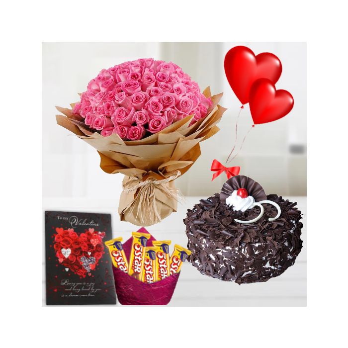 Beautiful Bunch of 40 pink roses , 1 pound black forest cake,pack of Five 5star chocolates, 2 heart shape balloons with Greeting card