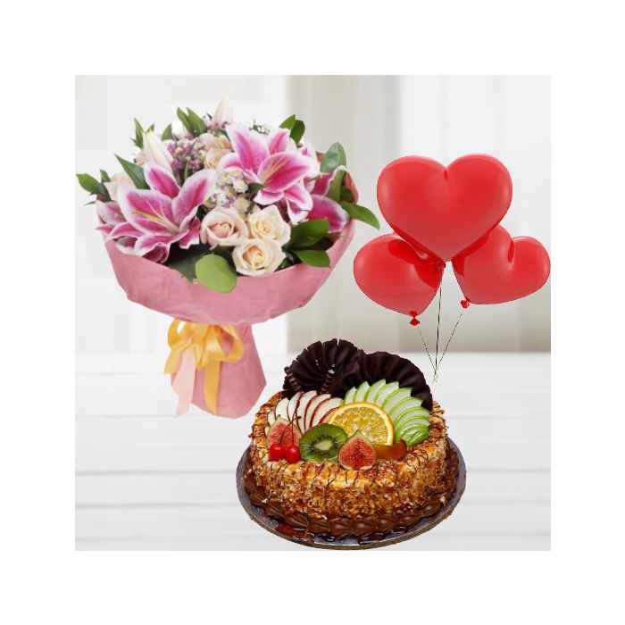 Beautiful Bunch of mix flowers including roses, lilies , carnations with mix fruit fresh cream cake with 3 heart shape balloons