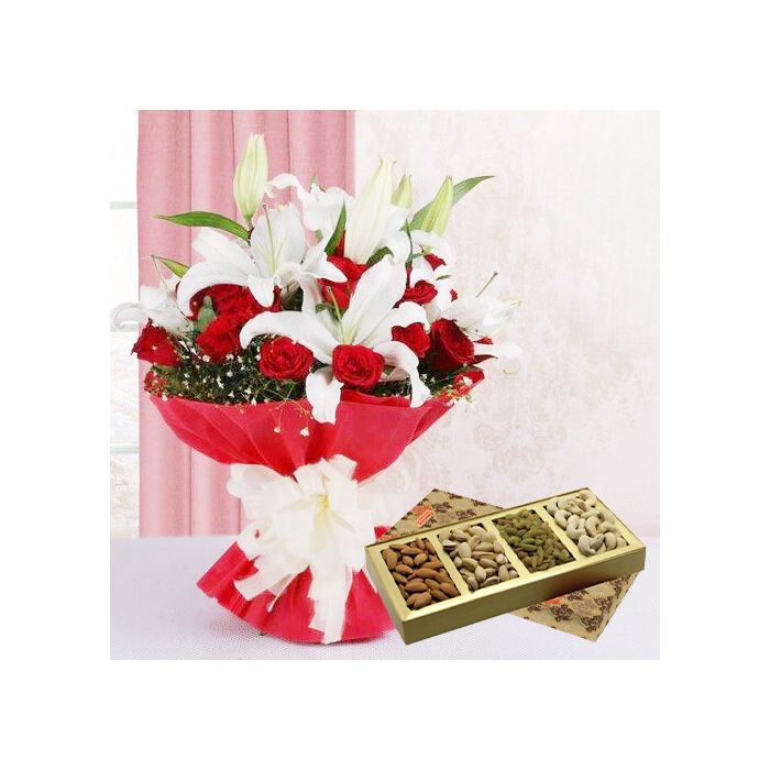 Looking for a way to show your loved ones how much you care? Why not surprise them with a beautiful bunch of white lilies and red roses, along with half a kilogram of assorted dry fruits? This scrumptious and nutritious gift is sure to put a smile on their faces and let them know that you're thinking of them. So go ahead and order this lovely gift today!