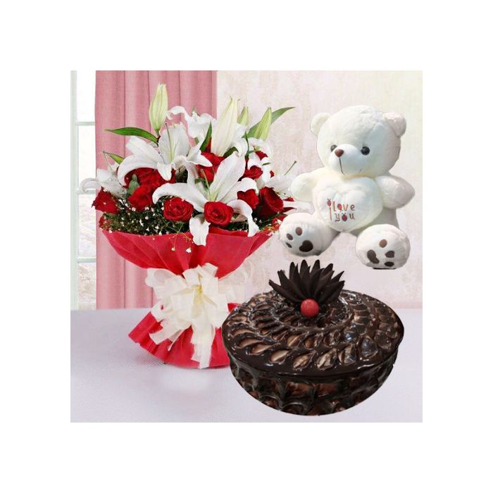 Looking for the perfect gift for that special someone in your life? Look no further than this beautiful bunch of white liliesarrangement with red roses! This stunning bouquet is arranged with love and care, and is sure to please! The addition of a delicious double chocolate cake and a 6 inch teddy bear make this gift extra special - they'll be sure to remember it forever!