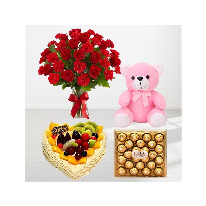 We are excited to offer this stunning vase arrangement of 20 red roses with red carnations, 24 pcs rocher ferrero chocolates,1 feet height pink teddy bear with mix fruit heart shape cake. This gorgeous arrangement is perfect for any special occasion, including anniversaries, birthdays, or even as a romantic gesture.The 20 red roses and red carnations are beautifully arranged in a glass vase, with the 24 pcs rocher ferrero chocolates adding a touch of sweetness. The 1 feet height pink teddy bear is the perfect finishing touch to this perfect gift. The mix fruit heart shape cake is also delicious and will be enjoyed by all.Order now and we will deliver