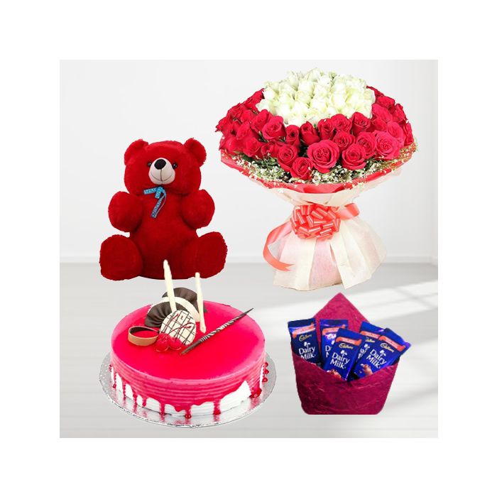 Looking for a gift that is sure to impress? Look no further than this gorgeous bouquet of 100 red and white roses! This stunning arrangement is accented with a delicious strawberry cake and a adorable 6 inch red teddybear, making it the perfect gift for any occasion. And to sweeten the deal, this gift also comes with a pack of 5 dairy milk chocolates! Sure to put a smile on anyones face, this gift is sure to be remembered.
