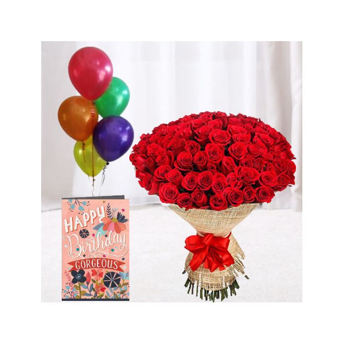 This Big Bunch of Gorgeous 50 red roses ,5 bunch of mix color balloons with birthday card is an amazing gift for someone special. The red roses are a symbol of love and affection, while the mix color balloons add a touch of fun and excitement. This birthday card is sure to make the recipient feel loved and appreciated.
