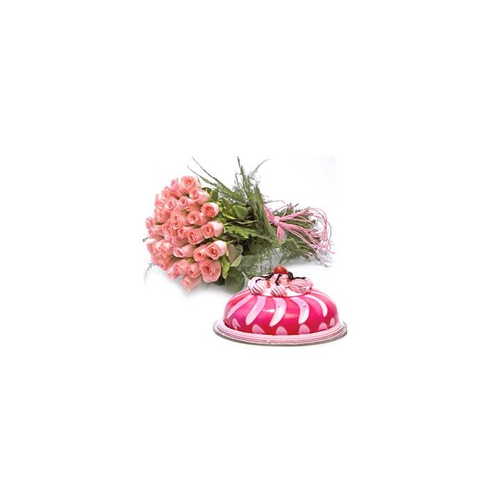 Product Description 1 | Bunch of 25 pink roses with 1 pound strawberry cake |