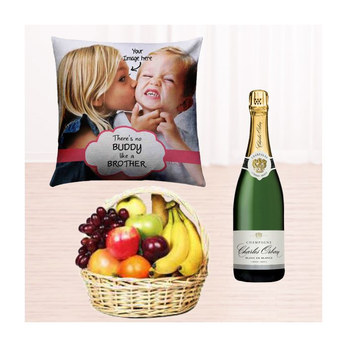 Looking for a unique and luxurious gift? Our bottle of champagne with photo cushion and seasonal fruit basket is the perfect choice!This stylish set includes a bottle of champagne, a photo cushion, and a beautifully presented fruit basket. The cushion features your favorite photo, making it a truly personal gift. The fruit basket is filled with delicious seasonal fruits, making it a perfect treat for any occasion.The champagne is from one of the most prestigious wineries in France and is sure to impress even the most discerning palate. It's the perfect way to celebrate a special occasion or simply show someone you care.The photo cushion is made with high-quality materials and construction, ensuring it will be treasured for years to come