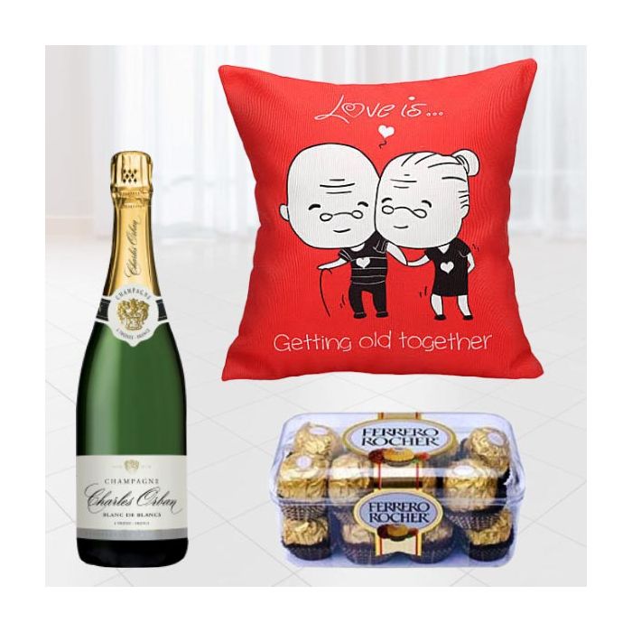 Bottle of champagne , 16 pcs rocher ferrero chocolates, photo cushion
