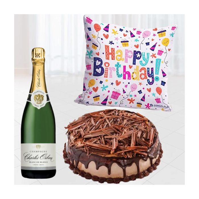 Welcome to the world of luxury and decadence! Our Bottle of champagne , half kg chocolate cheese cake with photo cushion is the perfect way to indulge in some opulence.This magnificent set includes a bottle of champagne , a decadent half kg chocolate cheese cake, and a gorgeous photo cushion. The champagne is a luxurious addition that will make any occasion special. The chocolate cheese cake is rich and indulgent, and the photo cushion is a beautiful way to capture memories.This set is perfect for a special occasion, a romantic night in, or simply as a way to spoil yourself. It's an unforgettable way to show your loved ones how much you care. Order now and experience the ultimate in luxury. Thank you for choosing
