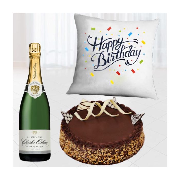 Bottle of champagne , half kg chocolate walnut cake with photo cushion
