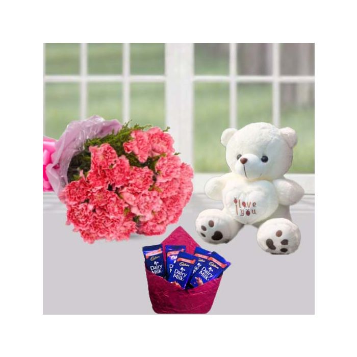 Welcome to our flower and chocolate extravaganza! This perfect pink carnation bouquet comes with ten gorgeously blooming flowers, arranged artfully by our floral experts. But that's not all- this bundle also includes a cuddly six inch teddybear and five delicious Dairy Milk chocolates. Send this to your special someone today and make their day extra sweet!