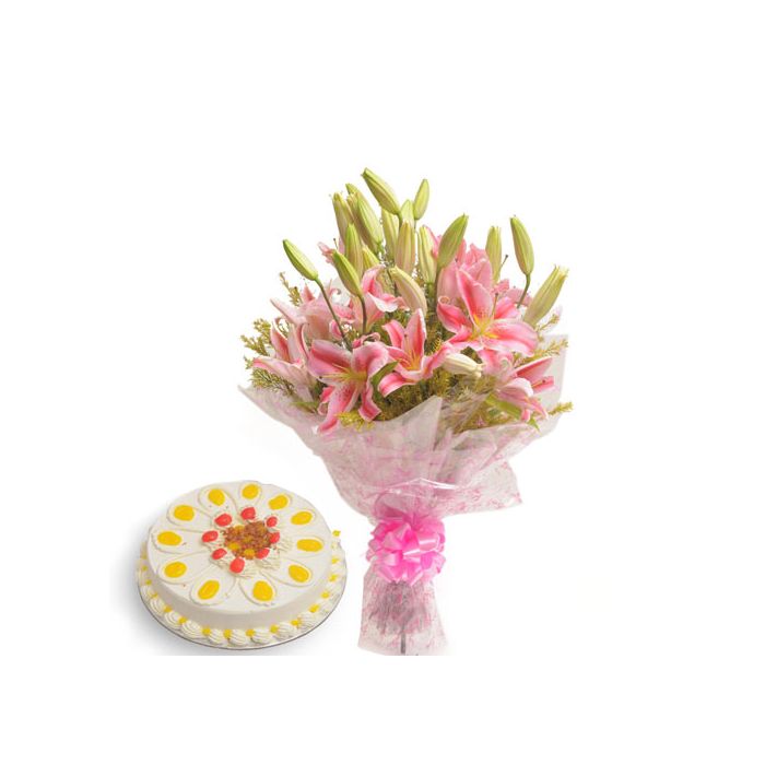 bouquet of 10 pink oriental lilies with 1 kg pineapple cake