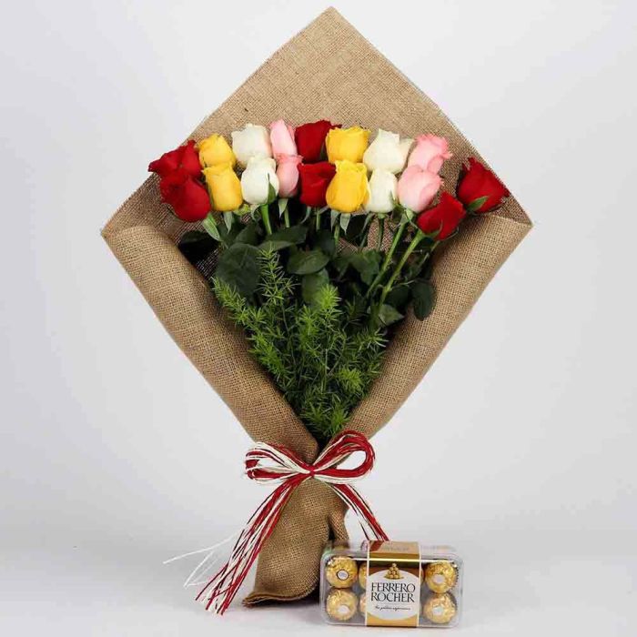 Bouquet of 18 mix roses with jute packing with box of 16 pcs ferrero rocher chocolates