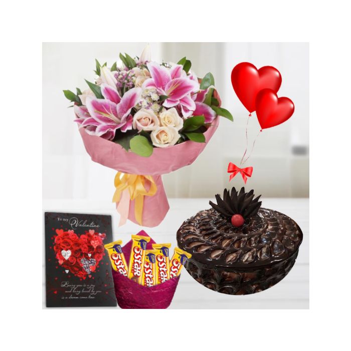 Bouquet of exotic mix flowers , half kg chocolate fudge cake, pack of Five 5star chocolates, 2 heart shape balloons , with greeting card