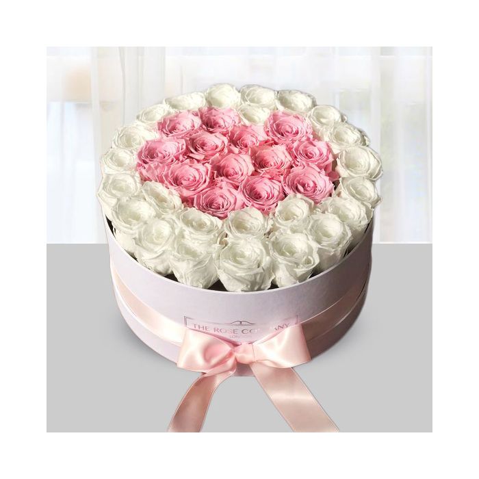 This box arrangement of 50 pink and white roses is the perfect way to show your love and affection. The beautiful roses are arranged in a box, making it the perfect gift for any occasion. The arrangement is hand-tied with a pink ribbon, making it extra special.