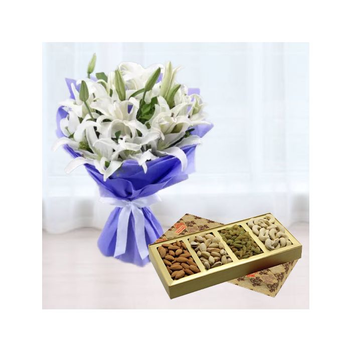 Product Description 5 | Box of assorted dryfruits with Bunch of asiatic lilies |