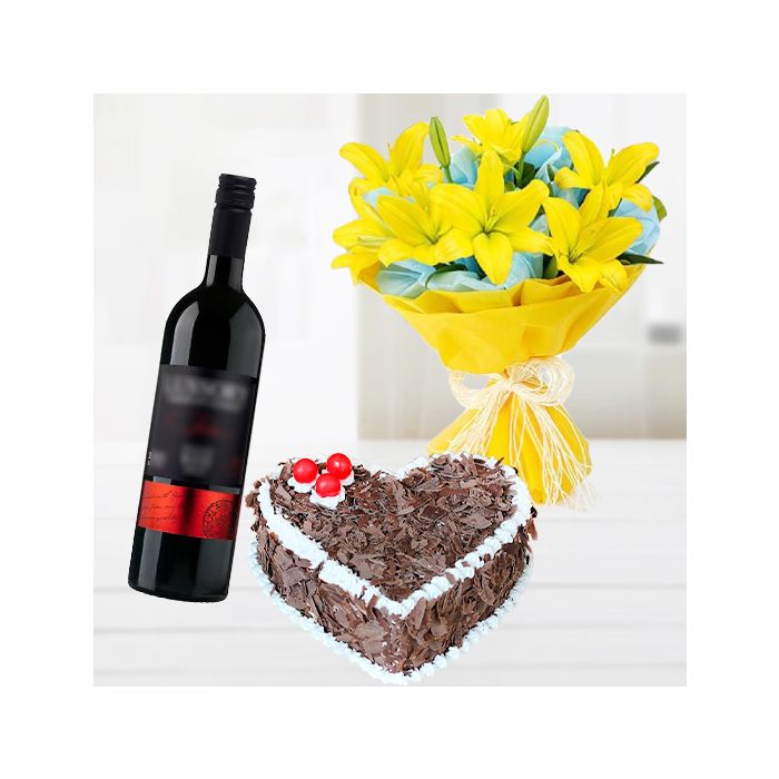 Product Description 5 | Bunch of 10 asiatic lilies with heart shape black forest fresh cream cake with bottle of red wine |