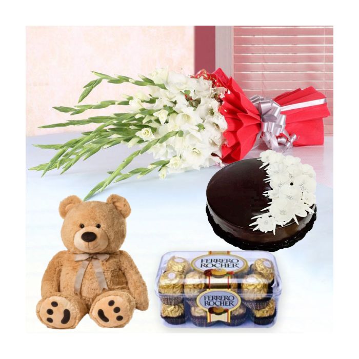 Product Description 1 | Bunch of 10 Gladiolus swith 16 pcs Ferrero Rocher, 6 inch teddy and chocolate cake |