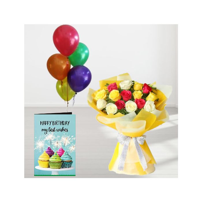 Bunch of 10 mix colour roses, 5 bunch of mix color balloons with birthday card