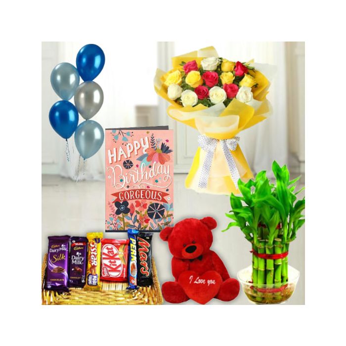 Bunch of 10 mix roses, basket of assorted chocolates, 6 inch teddybear 2 layer Lucky bamboo plant ,5 blown balloons with birthday greeting card