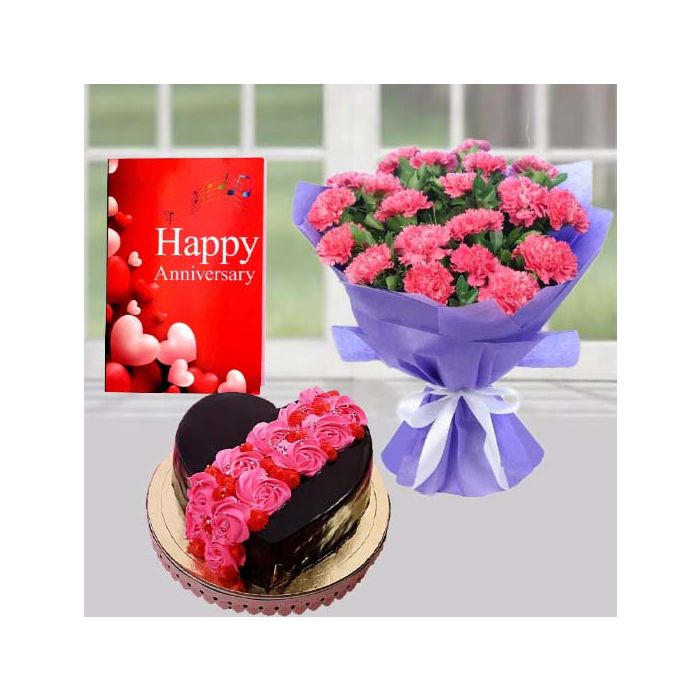 Looking for a special way to show your loved one how much you care on your anniversary? Look no further than this gorgeous gift set! It includes a beautiful bunch of 10 pink carnations, a delicious chocolate heart shape cake with floral topping, and an anniversary greeting card. This is sure to make your anniversary one to remember!