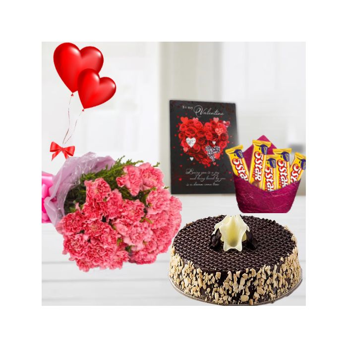 Bunch of 10 pink carnations, half kg chocolate walnut cake, 2 heart shape balloons, pack of five 5star chocolates with greeting card