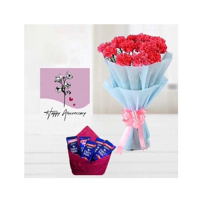 Looking for the perfect way to show your loved one how much you care on your anniversary? Then look no further than this beautiful gift set! It includes a lovely bunch of 10 pink carnations, two delicious dairy milk silk chocolates, and an anniversary greeting card. All of which are sure to put a smile on your special someone's face. So go ahead and show them just how much they mean to you with this thoughtful gift set.