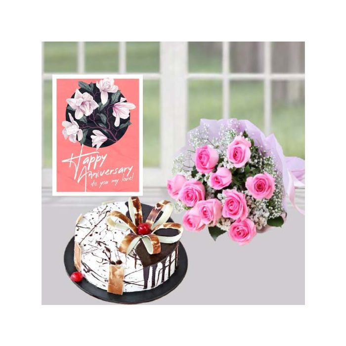 Say "Happy Anniversary" with this lovely gift set that includes a beautiful bouquet of 10 pink roses, delicious choco vanilla cake, and a heartfelt greeting card. Your special someone is sure to appreciate this thoughtful gesture.