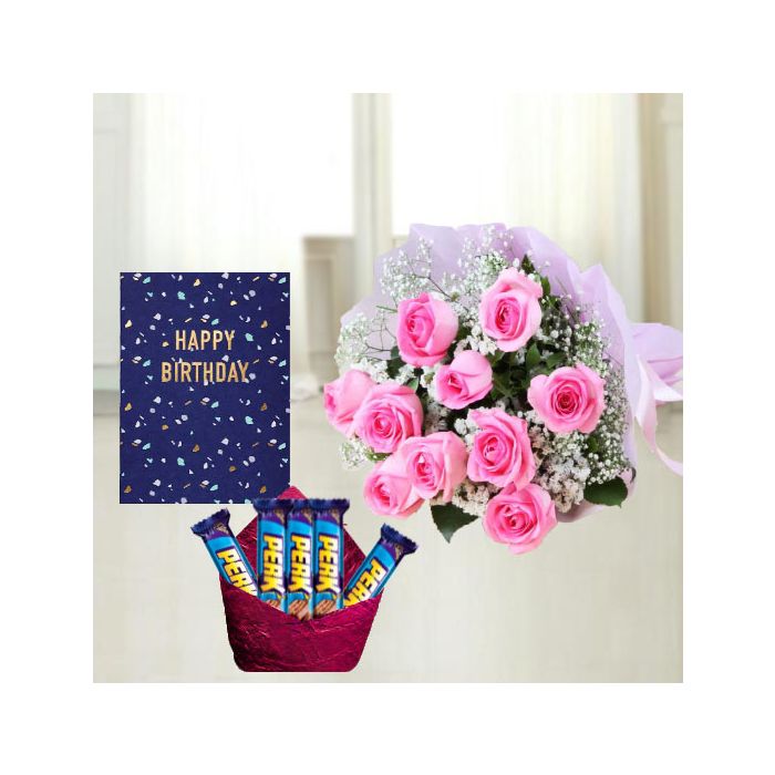 Bunch of 10 pink roses, pack of 5 perk chocolates, birthday greeting card