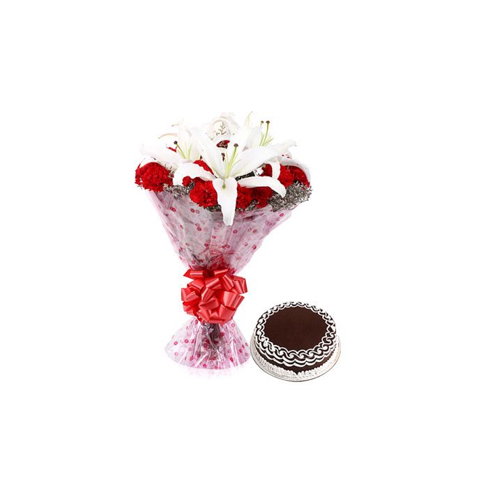 Looking for something special to show your loved ones how much you care? Look no further than this amazing bundle of 10 red carnations and 2 white lilies, expertly arranged with a 1 pound chocolate cake. The perfect way to celebrate a birthday, anniversary, or any other special occasion, this gift is sure to put a smile on their face.The carnations and lilies are beautifully fresh and vibrant, and the chocolate cake is moist and fluffy, with a rich and decadent flavor that will delight any sweet tooth. It's all presented in an attractive gift box, making it an extra-thoughtful present for someone you care about. So go ahead and make their day with this incredible gift!